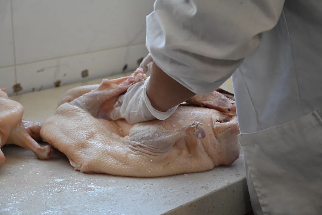 永平腊鹅的奥妙,首先在于原材料。“鹅要选本地老品种永平白鹅,养够9到12个月,腊月前后宰杀制作的品质最高。做腊鹅盐巴不能太重,清理干净才能透出鹅本身的香。”阿巧孃介绍道。清洗、去杂、精盐匀抹、压制成型、悬挂晾晒,十余道工序道道精细,全程手工操作。每一只腊鹅,都要经过半个月到一个月的自然发酵与风干,才能皮色金黄、白肉如玉、腊香浓郁。时间与经验的拿捏,决定了腊鹅最终的风味。