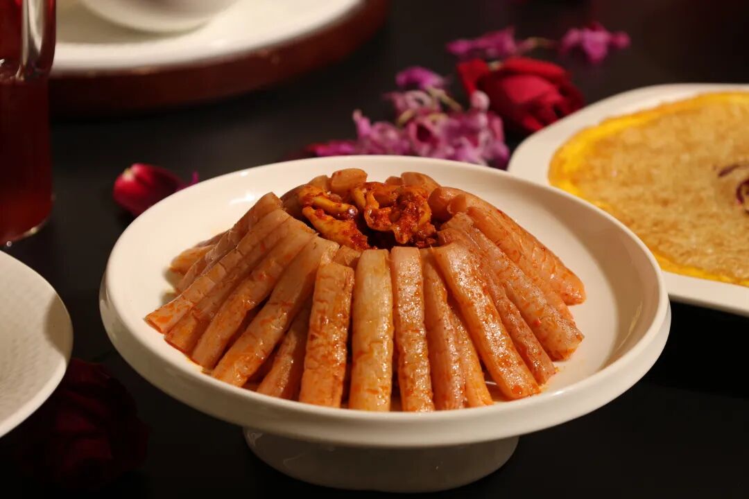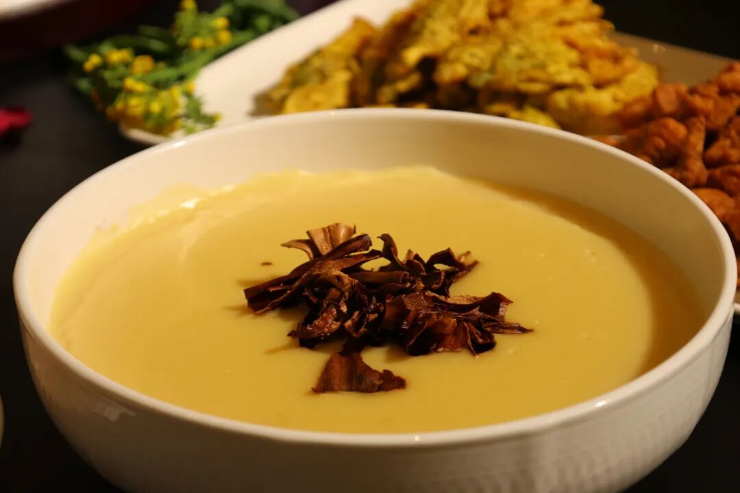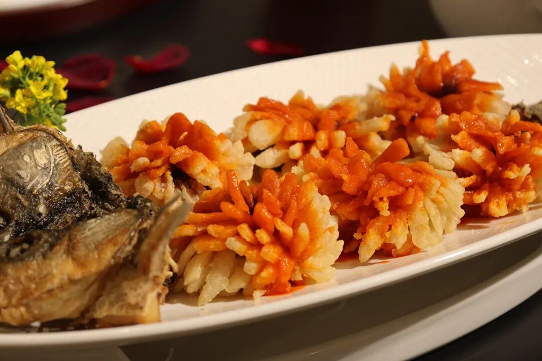 作为大理的传统菜肴,酸辣鱼在这桌春宴焕新登场。鱼肉精心雕琢,做成菊花模样,能更好地与酸辣汤汁接触,一口下去,鱼肉的鲜带着汤汁酸辣鲜亮,颜值与风味双在线,传统滋味亦有春日新意。