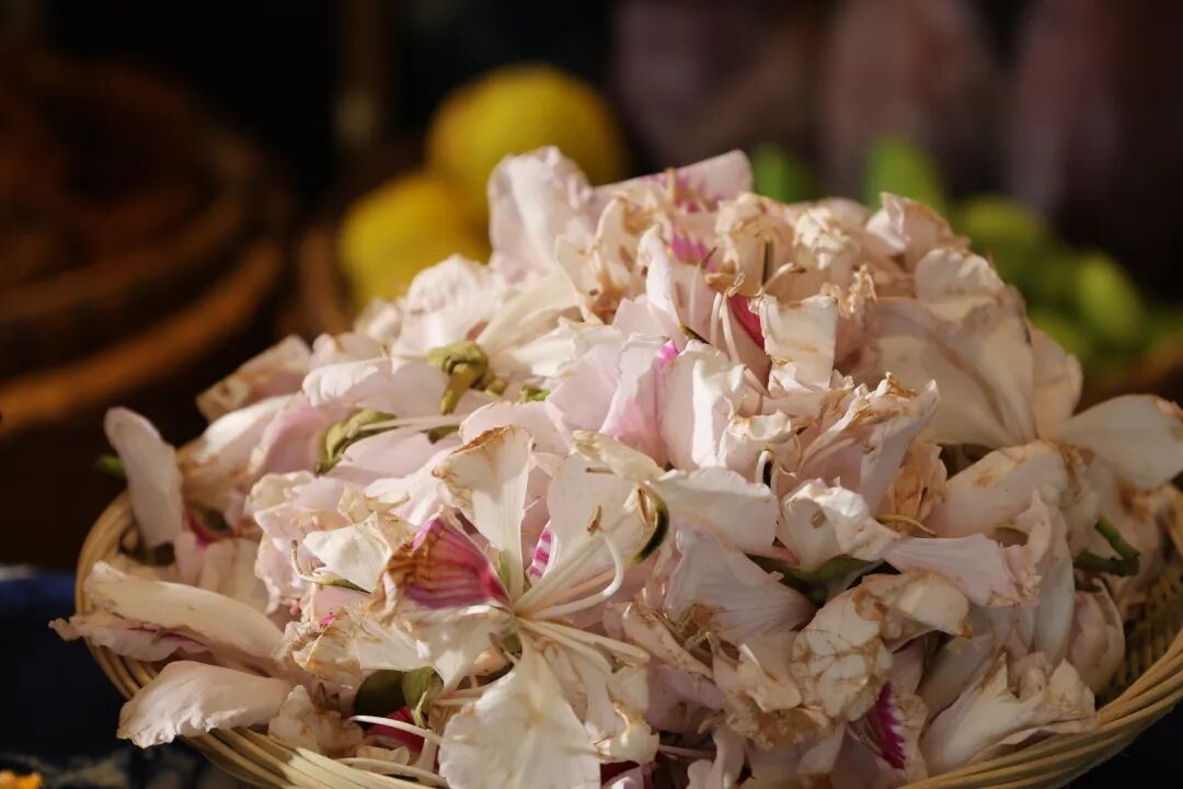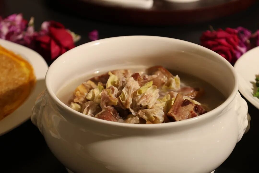 春日杜鹃花焯水去涩,与大理咸香火腿同煮。火腿的咸香浸润花瓣,杜鹃花的清爽化解火腿厚重,入口咸香中带着花香,鲜而不腻,润而不柴。