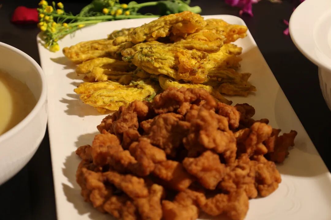 新鲜南瓜花裹粉炸至金黄,外酥里嫩,搭配香酥小酥肉,南瓜花的清甜与肉香相得益彰,一口下去,酥香四溢。