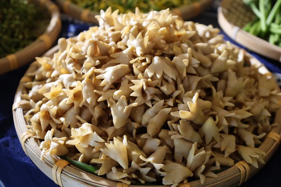 洁白柔嫩的白花,仿佛带着苍洱间晨雾的清新,搭配水豆豉,咸香醇厚裹住白花的绵软,入口先是豆豉的浓郁,后是白花的温润,每一口都是大理山野的质朴本味,清爽又开胃。
