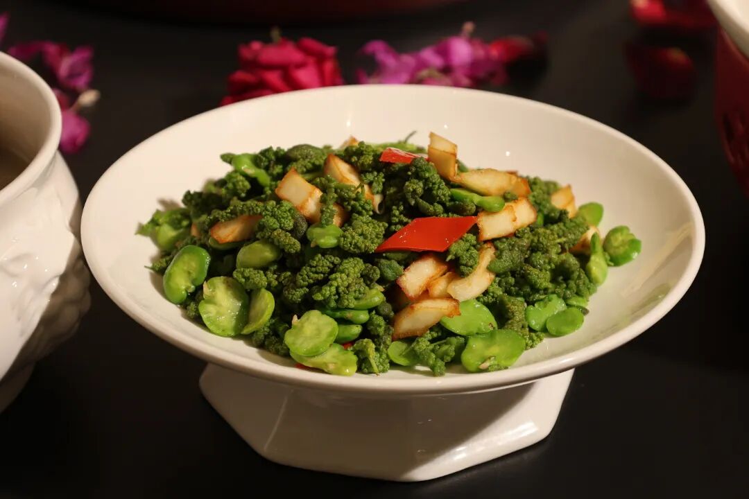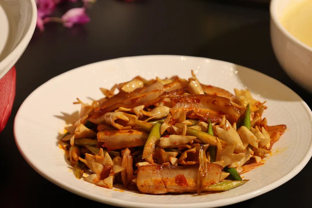 脆嫩的石榴花与咸香的回锅肉大火快炒,花瓣爽脆平衡肉香浓郁,赋予家常滋味别样春日风味。