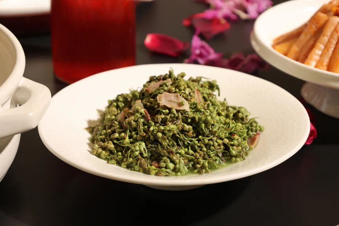 棠梨花经过清炒,入口柔韧而有嚼劲,初尝时舌尖会捕捉到一丝微苦,但这苦味很快便消散,转为一种清新的回甘。当它与咸香丰腴、油脂莹润的火腿片一同咀嚼,两种风味在口中交织融合,便是山野间最质朴、最本真的春日滋味。