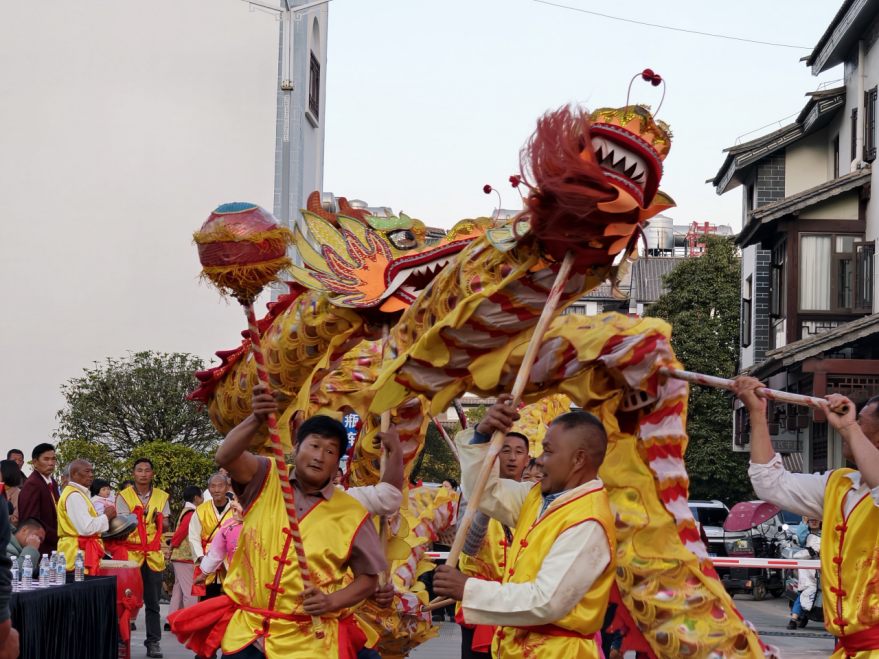 锣鼓喧天闹新春,龙狮游演送吉祥。活动期间,威武灵动的耍龙舞狮队伍从曲硐西门街送郎桥出发,沿街巡游至民族文化广场,最终抵达游客接待中心进行集中展演。
