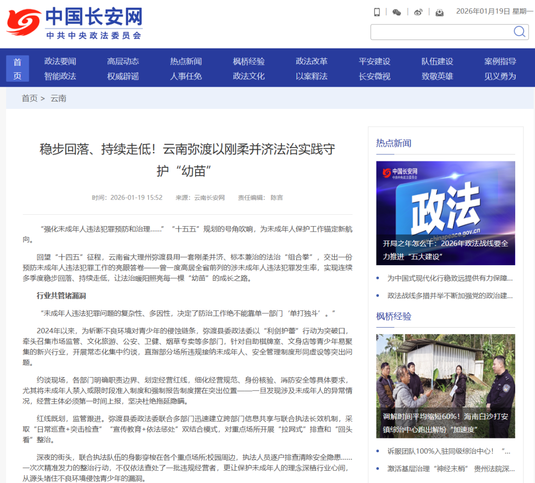 回望“十四五”征程,云南省大理州弥渡县用一套刚柔并济、标本兼治的法治“组合拳”,交出一份预防未成年人违法犯罪工作的亮眼答卷——曾一度高居全省前列的涉未成年人违法犯罪发生率,实现连续多季度稳步回落、持续走低,让法治暖阳照亮每一棵“幼苗”的成长之路。