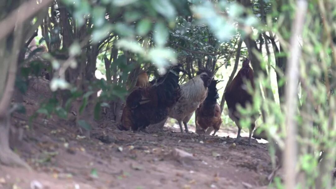 一群群乌骨鸡在林间穿梭觅食