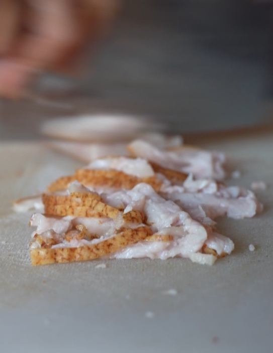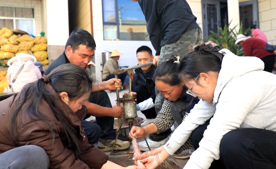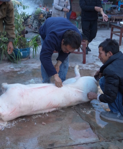 烫水褪毛,谷草燎皮,火光中烤出诱人的金黄。刮洗洁净后,手起刀落的分割开始了——鲜肉、头蹄、内脏、骨头各归其处。一部分随即送入厨房,化作热气腾腾的锅中佳肴;另一部分仔细调配、灌入肠衣,在时光与烟火中腌成腊味,将一年的鲜香留存到往后的日子。