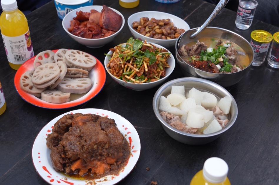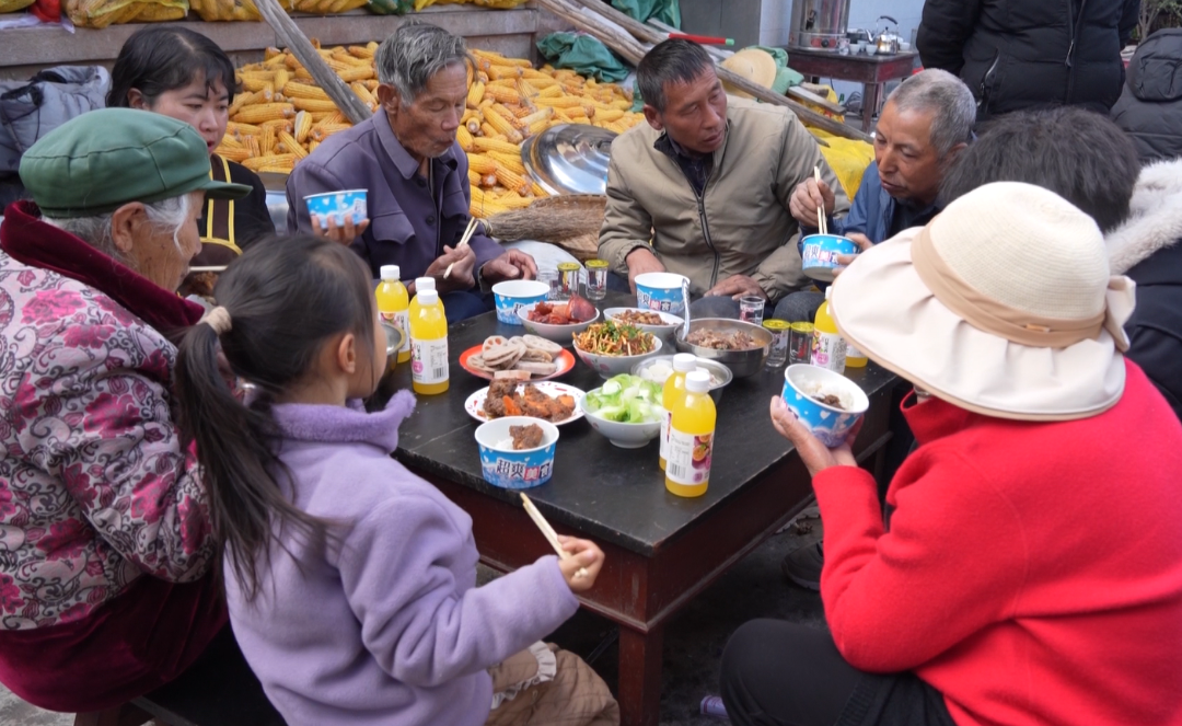 时至下午,炭火余温未散,“土八碗”已压轴而来。男人们利落地摆开桌椅,女人们穿梭着端上一道道热气腾腾的菜肴。亲友乡邻围坐在一起,杯中酒暖,盘中菜香,一年的辛劳与收获,都融在这热热闹闹的团聚里。