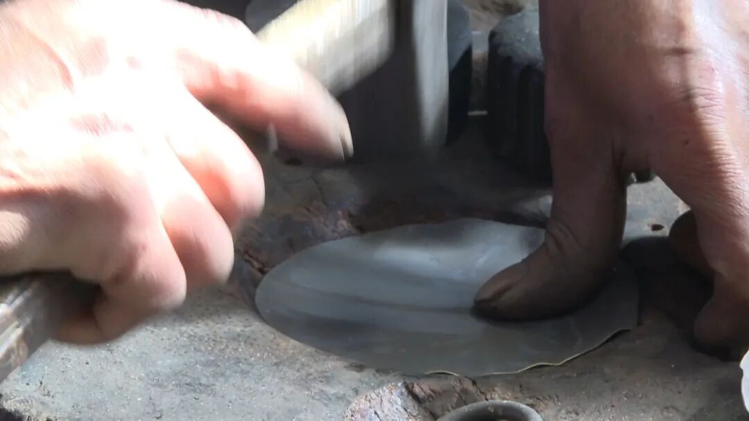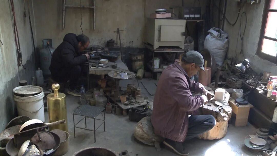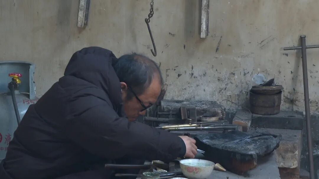 在离传习所不远的青海营村,曹立国和儿子正在自家的工坊里,赶制顾客定做的器具。曹立国14岁开始跟随家中长辈学习小炉匠银器制作技艺,在外挑担走四方十余年,后回乡开起手工加工作坊,将产品批发给周边的经纪人,带到外地销售。几十年间,曹立国还广泛收徒,培训出大批功底扎实、手艺精湛的徒弟,不断传承小炉匠银器制作技艺。