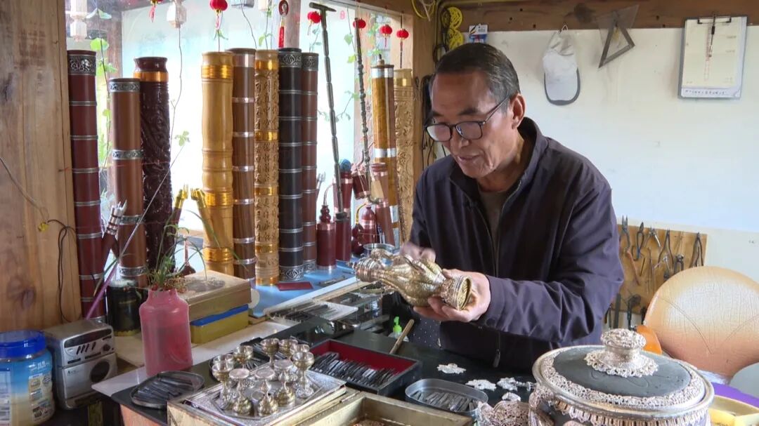 杨积功13岁跟随父亲学艺,成为一名走村串寨的小炉匠。50多年间,从补锅打铁到锻造银器,他练就了精湛的錾刻技术,制作了大批精美且具有传承价值的民族工艺品。如今,杨积功已经带出了几十个徒弟,自家后辈也在学习传承这门技艺。