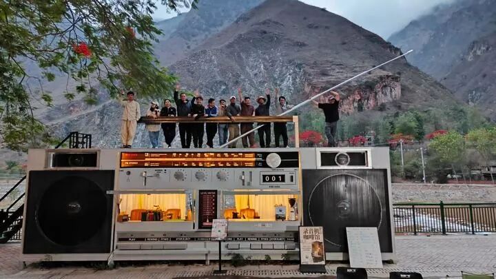 游客在绿汁镇“录音机咖啡馆”顶合影留念 图源:新华社