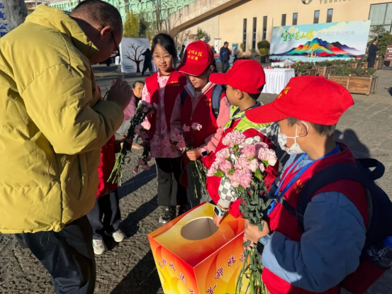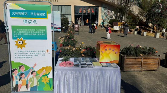 在“火种换鲜花,平安带回家”倡议点,登山游客积极响应,主动将火源投入指定回收箱,换取鲜花或种子卡片。