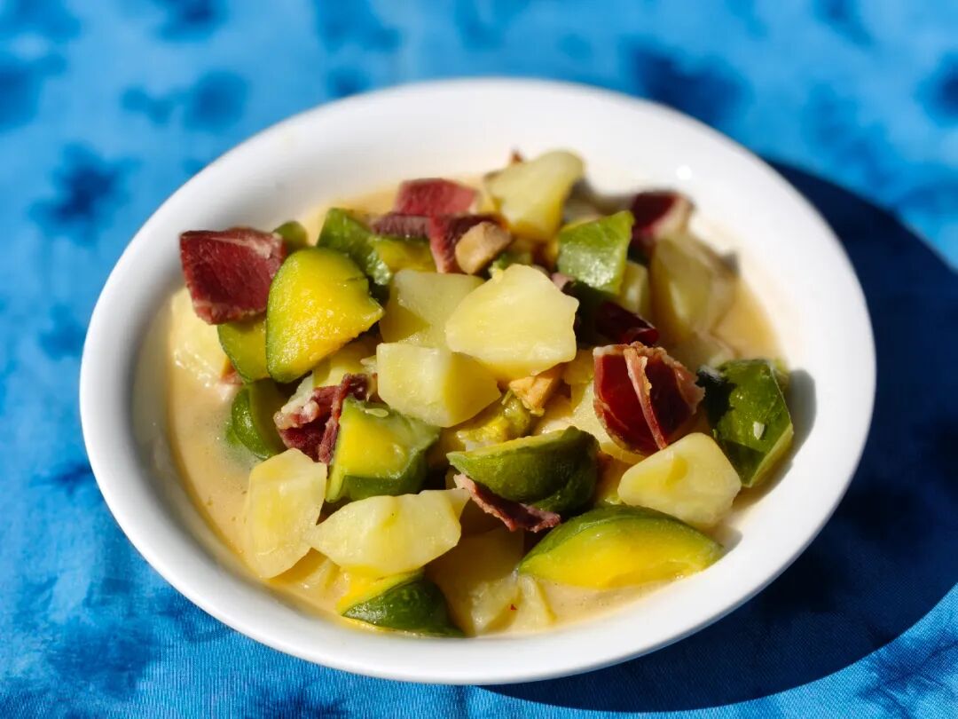 地道的云南家常菜,将火腿的咸香与蔬果的清甜完美融合。火腿的咸香渗透进蔬果,洋芋沙糯,小瓜清甜,咸淡适中,家常味十足。