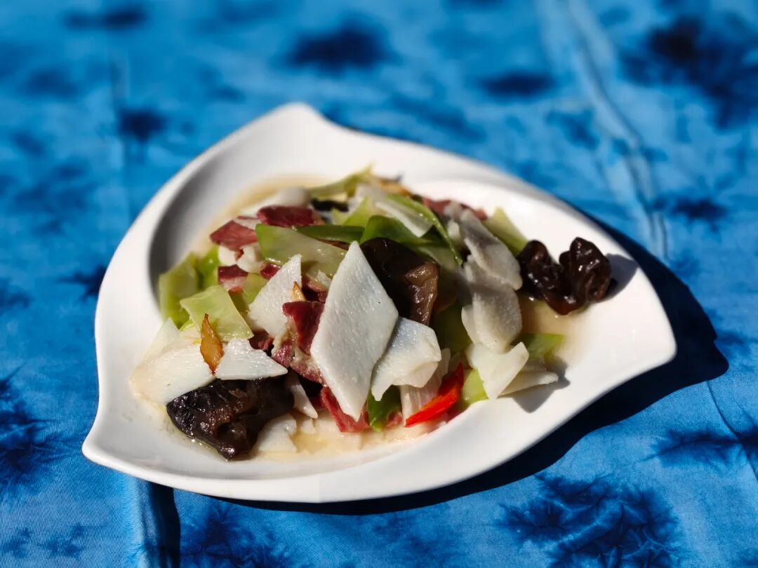 山药、木耳、莴笋与火腿的鲜味碰撞,是云龙版的“三鲜”盛宴。火腿的咸香油脂丝丝渗透,将山药的粉糯清甜与木耳的爽脆弹牙层层包裹,口感软糯与爽脆交织,一口尝尽山野鲜醇的烟火滋味。