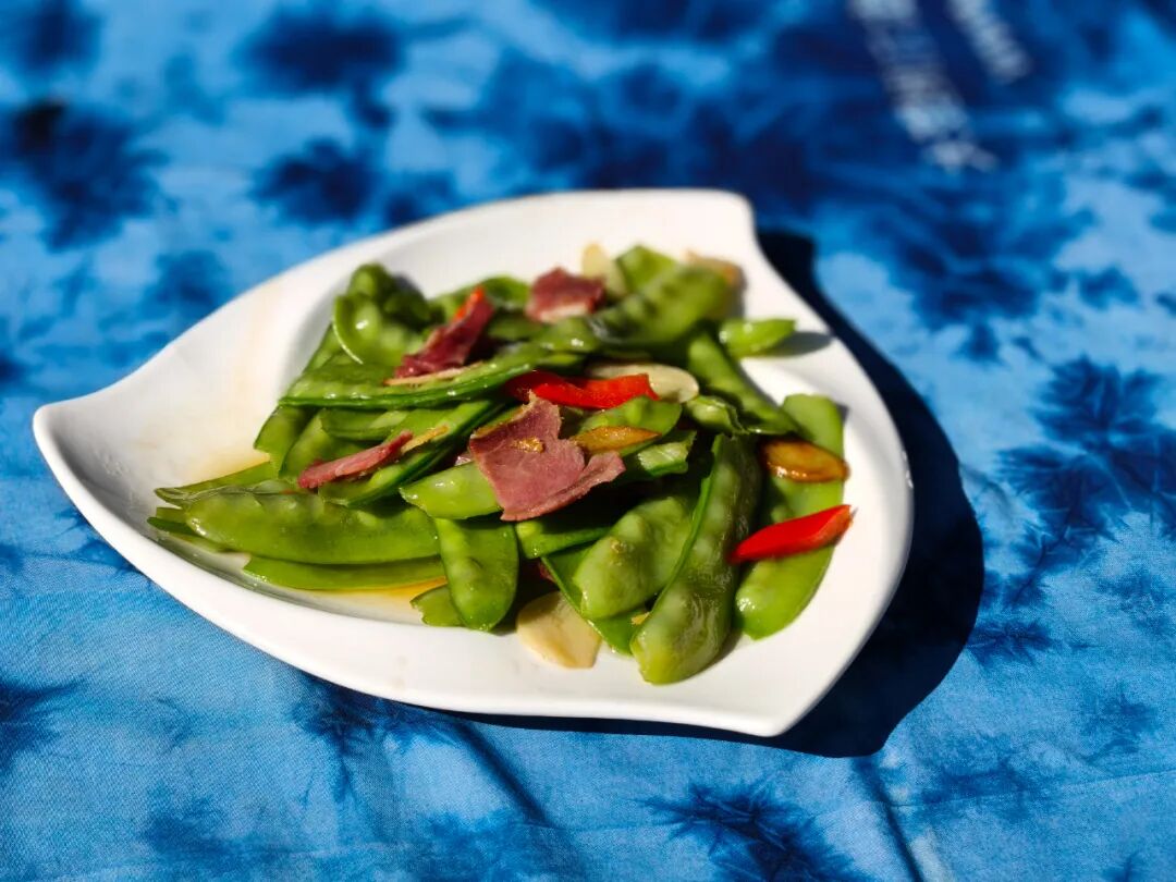 火腿的咸香醇厚渗入每一寸翠嫩的豌豆荚,色泽分明的红亮火腿与碧绿豆荚相映成趣。咬下时汁水迸发,咸鲜与清甜交织碰撞,脆爽不腻。