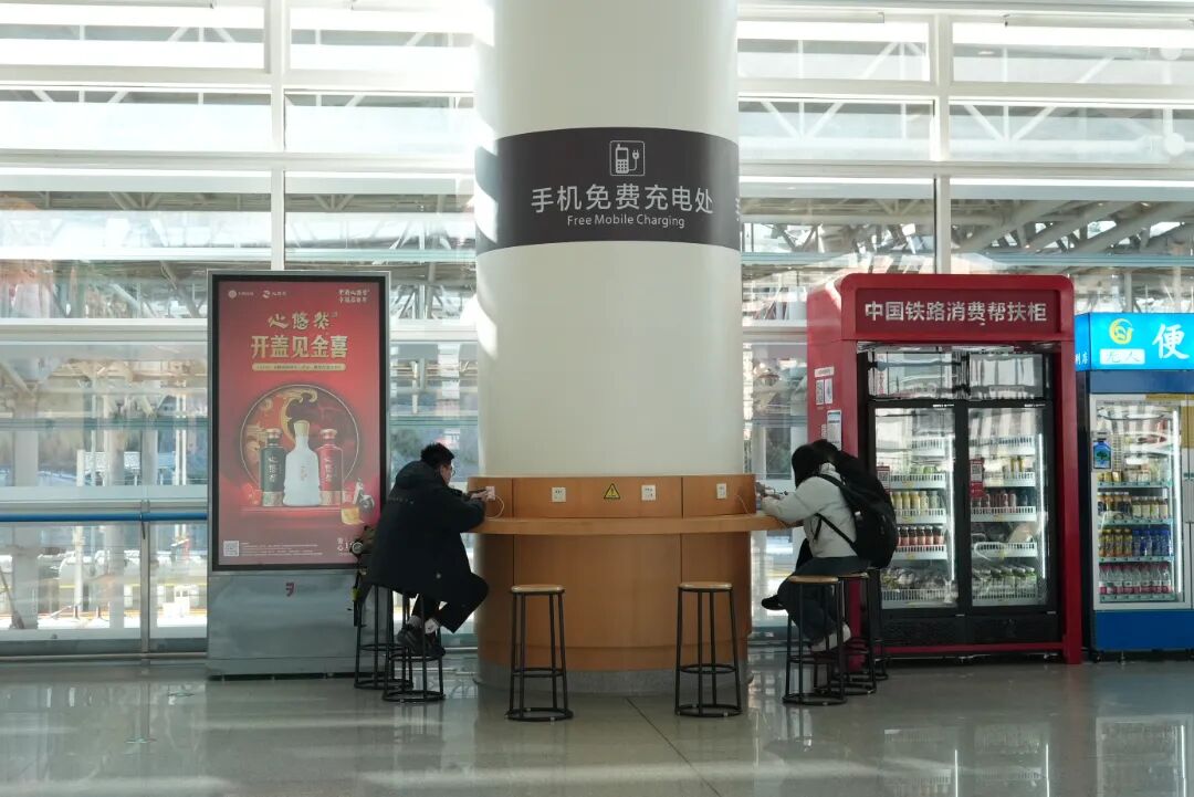 同时,补充设置免费充电区,在一楼和二楼候车室东西两侧共设置5个点位,可满足旅客手机等便携电子设备的充电需求。