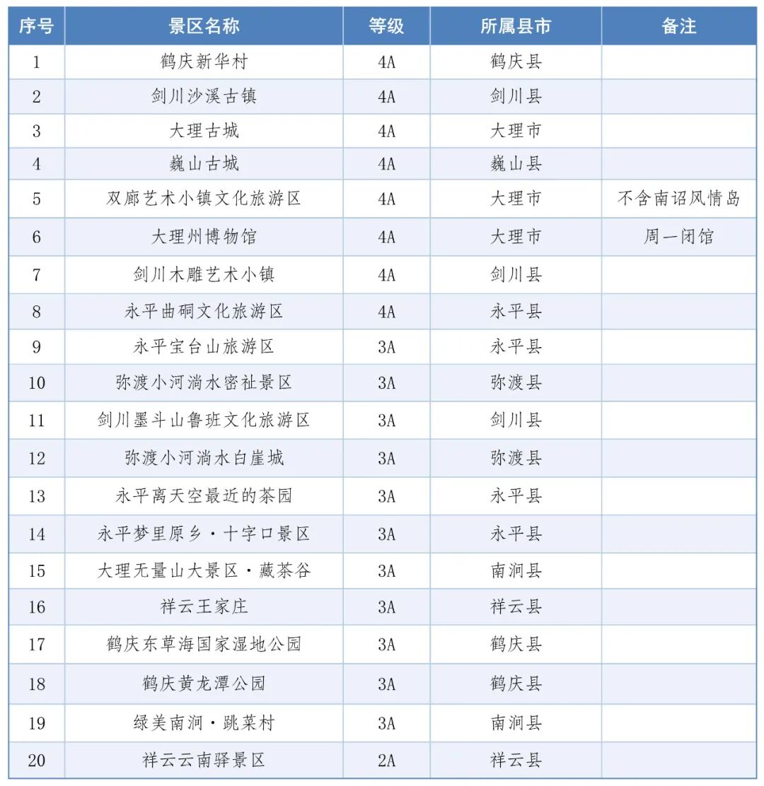 ↓大理州开放式免门票A级景区名单↓