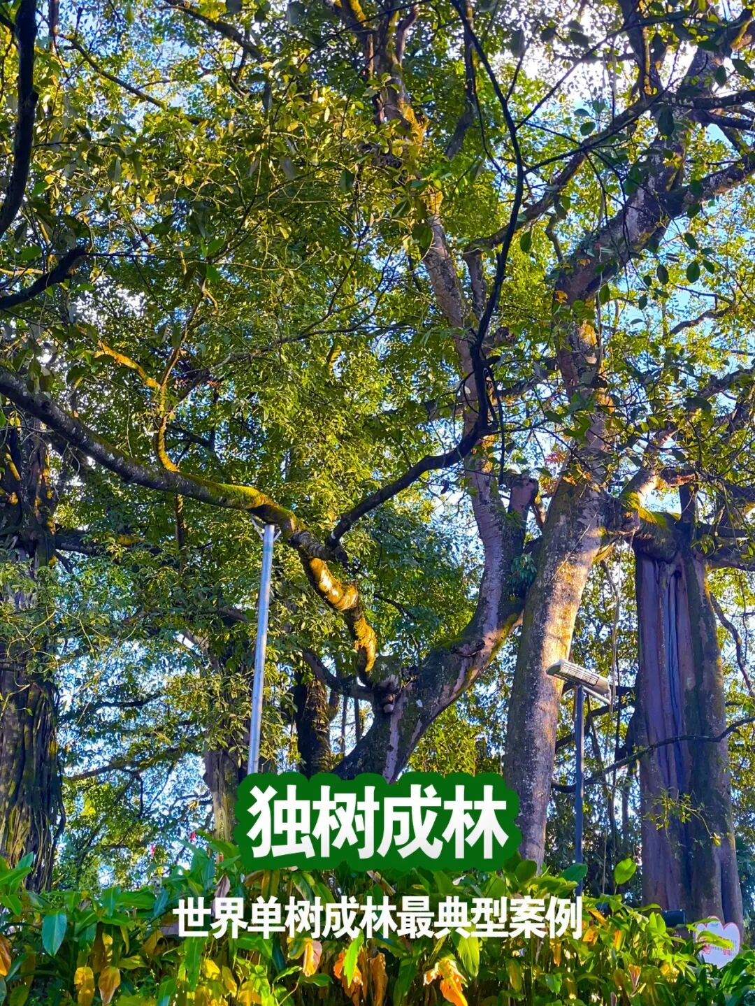独树成林的树木主要为高山榕,其独特的气生根系统是造就这一奇观的关键。无数气生根从树枝上垂直而下扎入泥土,不断生长发育成新的树干,与主树干相互交织,共同构建起一个庞大且独特的生态系统,形成了“一棵树就是一片森林”的奇妙景观。