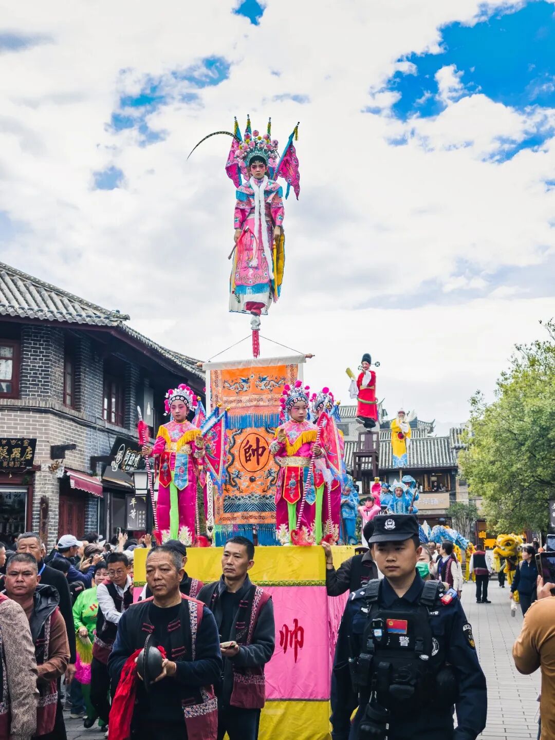 锣鼓声震,唢呐嘹亮,省级非遗项目高台社火踩着节拍缓缓而来。《老君点化细奴逻》《穆桂英挂帅》等经典故事,被抬上高台、搬进街巷。300多人的传习团队带来三台社火巡游,从南诏文化广场到文华书院,小演员们造型惟妙惟肖,引得游客纷纷举起手机:“第一次见,太新奇了!”