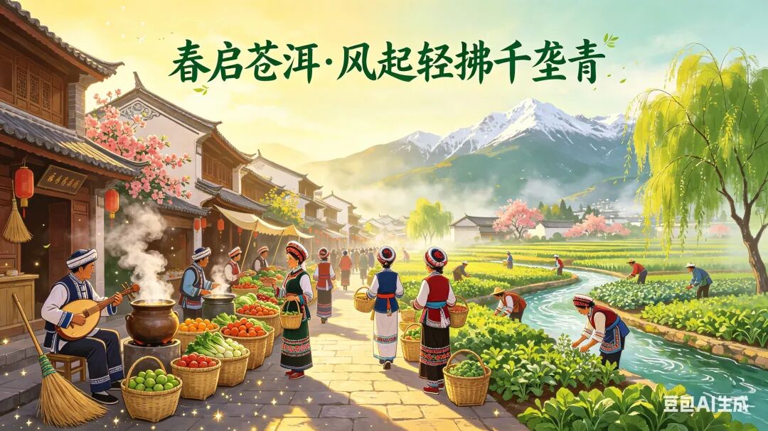 长街帚影挑星落,三弦声起唤晨烟;城内乳香陶罐沸,巷陌喧嚣竹筐鲜。苍巅雪润杜鹃艳,碧溪波摇柳色妍;最是农家播新种,风拂青翠入云巅。