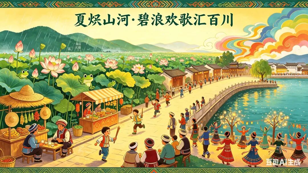 万顷荷风送暑天,雨霁蟾鸣满甸欢;草编遮暑街边卖,七彩流霞巷尾观。稚子笑擎松火戏,乡邻醉话黍粱年;长街列炬万人追,洱岸火树舞袖连。