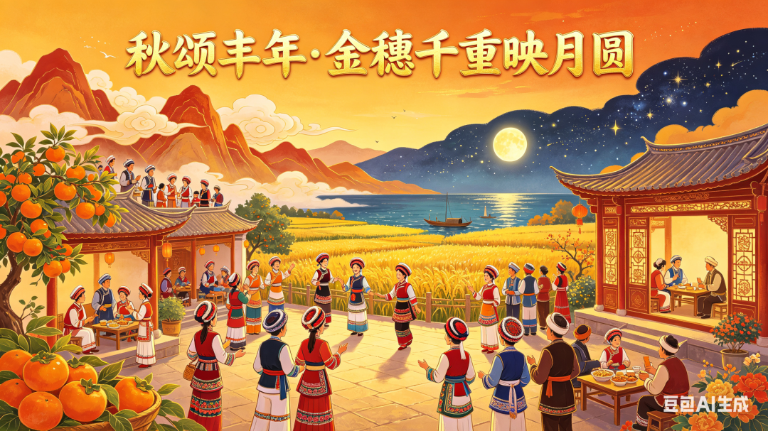 云裳变幻绕峰间,千松翠影笑语甜;橙黄橘绿缀庭院,金稻翻涛接远天。洱海浮天升皓魄,雕窗对影话月圆;向晚渔舟归唱里,星河飞歌庆丰年。