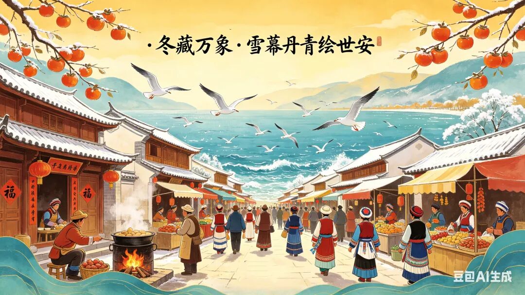 暖冬依旧眷苍穹,霜点青畴柿点红;忽惊雪羽凌波至,争看银鸥逐浪空。火塘煨薯家常暖,新联福字映门栊;试问人潮何处涌?千年街市正春风!