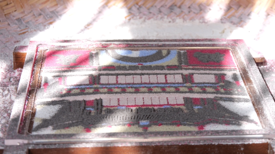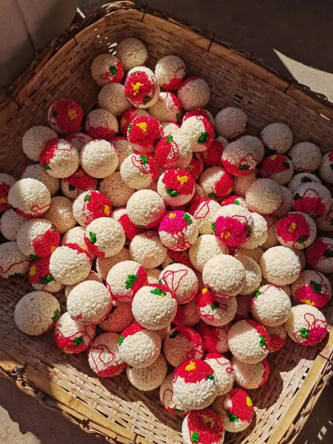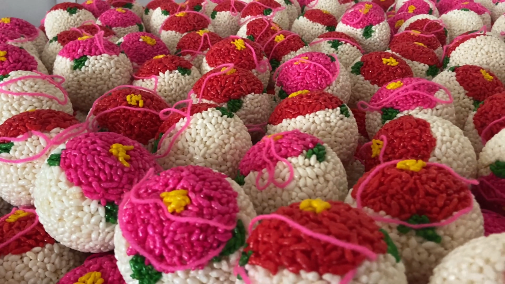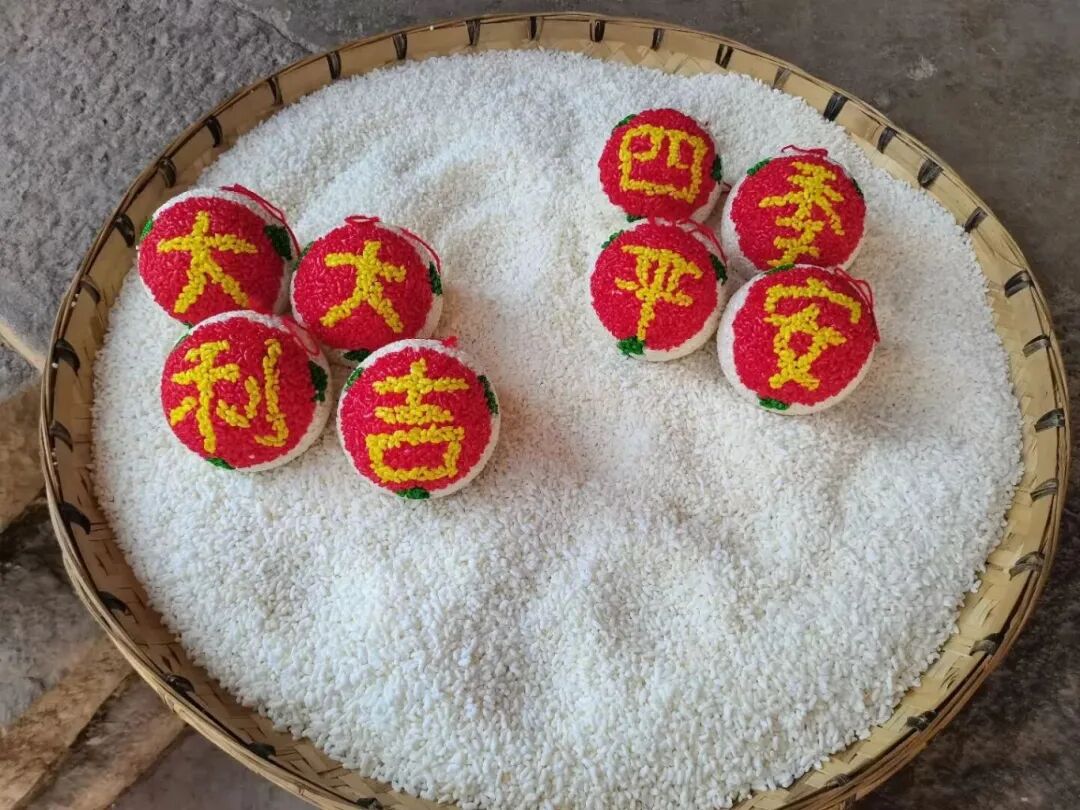 圆糖的制作,糯米要历经“三天浸泡、三天阴晾”的工序,晒干后的米粒与河砂同炒,火候全凭经验。最考究的是成型——先用大碗固定形状,换小碗反复“簸”动让糖体紧实,最后用最小号的碗沿进行磨光,直到圆糖表面光滑紧实,红、黄、绿三色进行点缀,“大吉大利”“四季平安”“五谷丰登”等吉祥语跃然其上。