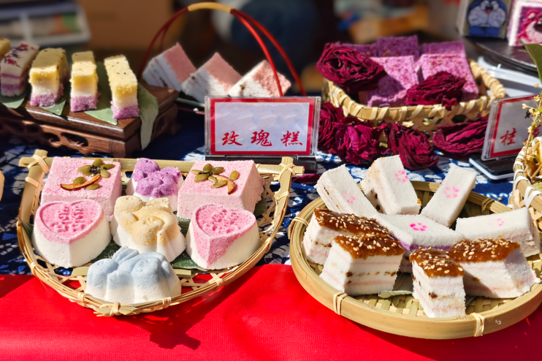 在鹤庆,米糕的样式丰富多样,寓意满满,是鹤庆人逢年过节必不可少的美食。如今,玫瑰、抹茶新口味也加入进来,但最让老顾客惦念的,还是那口红糖芝麻的原味米糕,菱形干糕层次分明,红色腰线是香甜的红糖,一口下去,软糯里带着韧劲,美味十足。