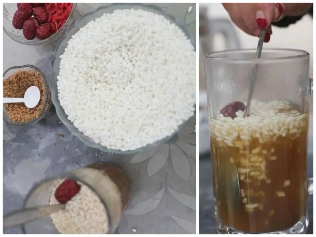 圆糖大小不一,直径从五厘米到三十厘米不等,是过年时走亲访友的最佳伴手礼。除了圆糖,糯米米花配上红糖、大枣、枸杞,滚水一冲,便是一杯甜暖的米花茶,这也是过年期间必不可少的饭后甜食。