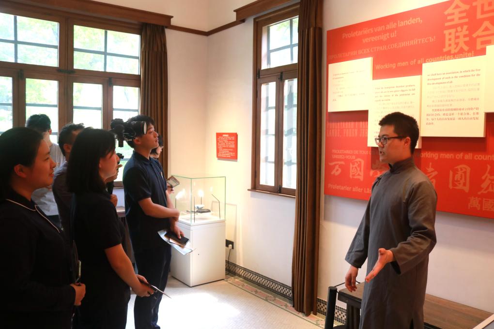 2024年5月26日,在上海复旦大学《共产党宣言》展示馆,复旦大学生命科学学院学生冀凌宇(右一)为观众讲解。(受访者供图)