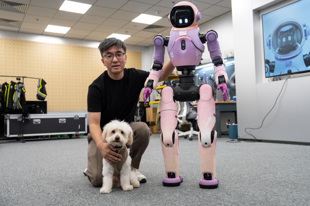 2025年11月12日,在“模速空间”大模型创新生态社区,上海魂伴科技创始人兼CEO真地与自己的小狗和机器人合影留念。新华社记者才扬 摄