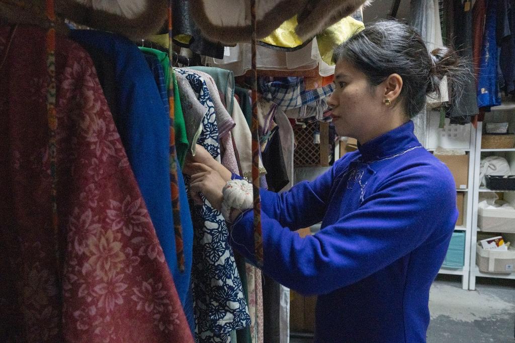 2025年11月13日,在上海川沙古镇,古镇东侧旗袍工作室店主阳慧整理服装。新华社记者董博婷 摄