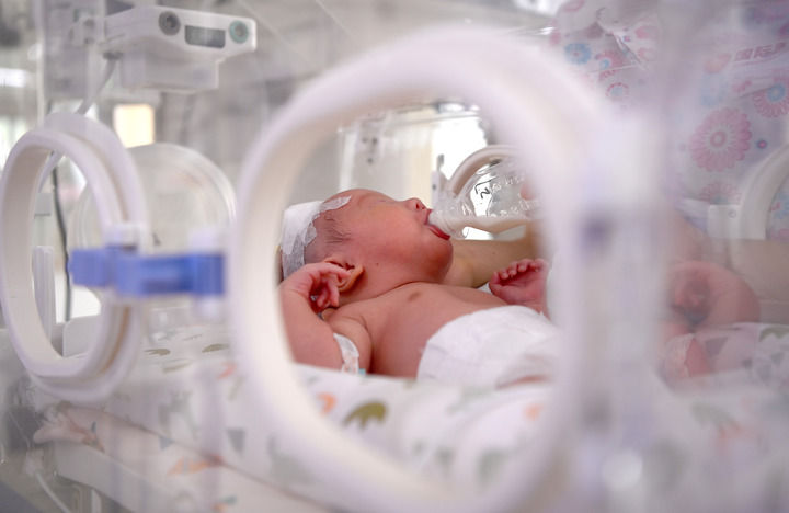 2024年6月1日,在西安国际医学中心医院新生儿科病房,护士为新生儿喂奶。新华社记者刘潇摄