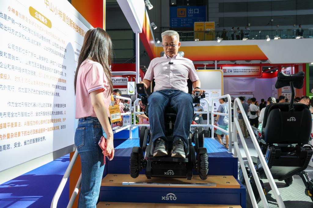2025年9月12日,在2025深圳国际智慧养老产业博览会上,观众在展会现场体验一款可以上下楼梯的智能出行机器人。新华社记者 梁旭 摄