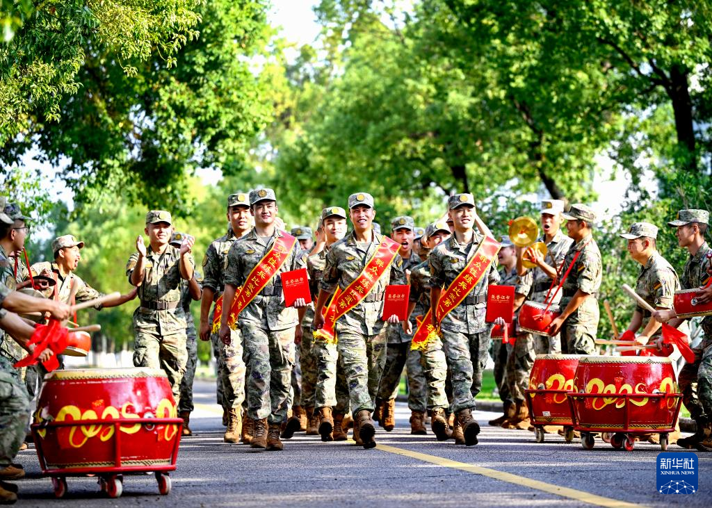 火箭军某旅发射二营参赛官兵比武夺魁载誉归来,受到战友们热烈欢迎(资料照片)。新华社发(刘明松摄)