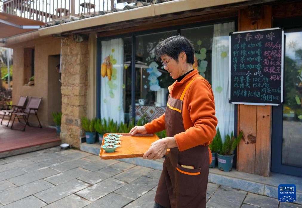 12月20日,来自四川的旅居客赵发英在曼海村自己开的咖啡书吧内为游客服务。新华社记者 陈欣波 摄