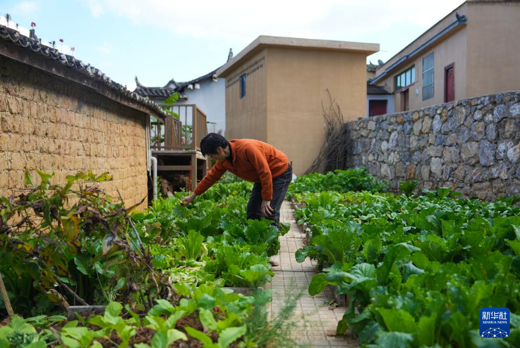 12月20日,来自四川的旅居客赵发英在曼海村查看自己种的蔬菜。新华社记者 陈欣波 摄