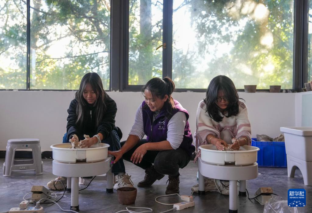 12月20日,研学讲师(左二)在曼海村研学中心教游客制作陶器。新华社记者 陈欣波 摄