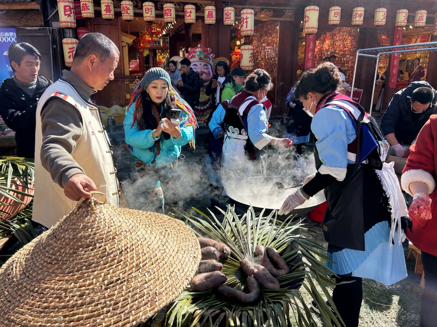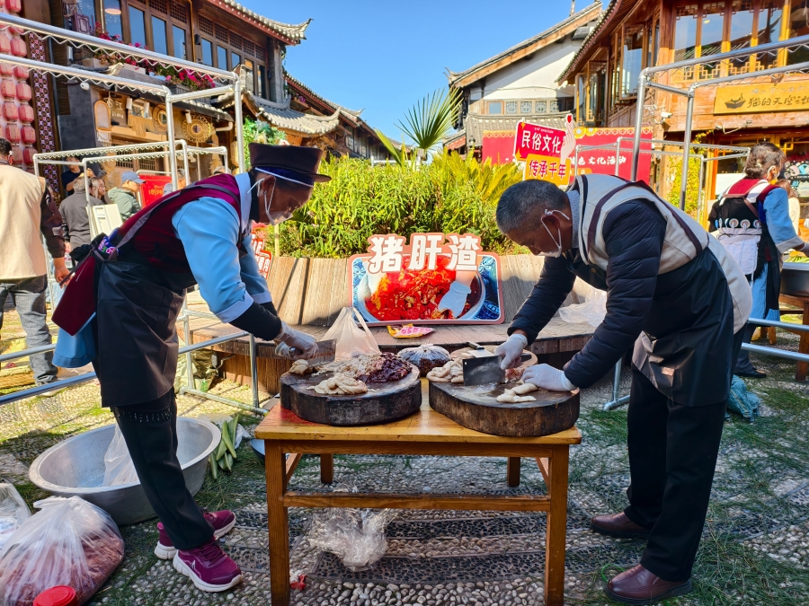 在活动现场,游客能近距离观赏米灌肠、腊排骨、猪肝渣、吹肝等纳西族特色美食的制作过程,感受纳西族传统饮食文化的精髓。同时,现场烤制的猪肉烧烤香气四溢,猪肉烧烤、腊肉、米灌肠、腊排骨、火腿等特色美食免费向游客供应,大家围在美食摊前品尝,共享这份纳西族的年味盛宴。