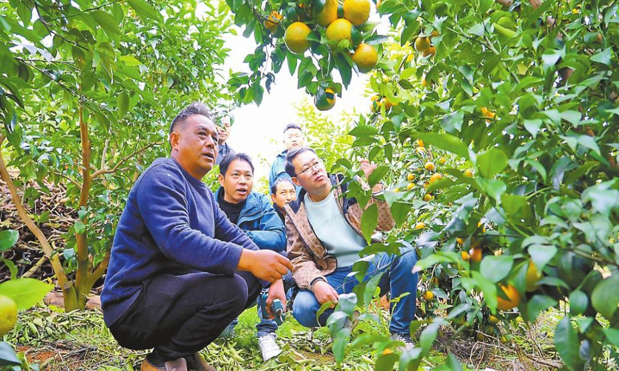 柑橘科技小院的专家在果园进行指导。