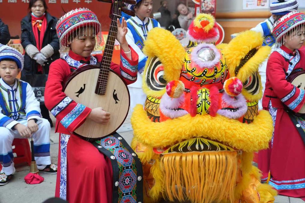 身穿土家民族服饰的孩子们演奏建始丝弦锣鼓。新华社发(侯康 摄)