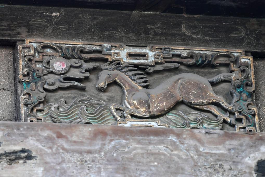 这是在山西省运城市关帝庙拍摄的古建顶上的飞马造型装饰构件。