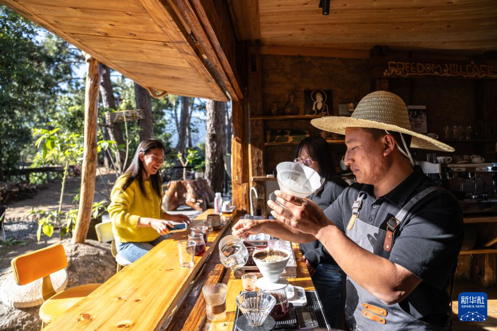 1月21日,咖啡师(右)在临沧市临翔区邦东乡昔归村昔归咖啡庄园为顾客制作咖啡。新华社记者 高咏薇 摄