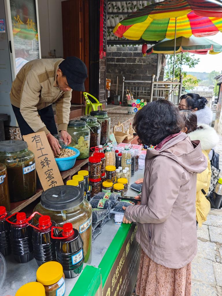 1月22日,游客在脱贫户杜袭年经营的土特产店摊位前选购产品。(梁雨浪 摄)