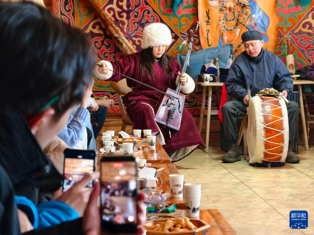 1月30日,台湾青年在新疆喀纳斯景区的木屋欣赏蒙古族图瓦人演奏。新华社记者 贺小童 摄