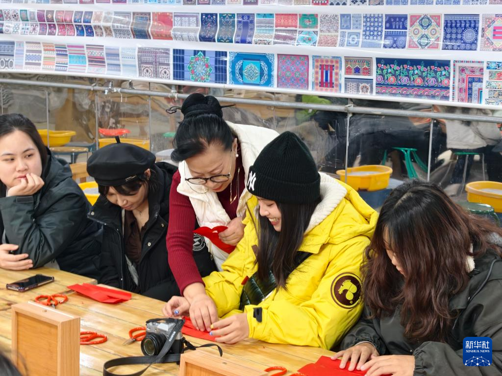 1月27日,台湾青年在位于新疆石河子市的新疆非物质文化遗产研究中心体验剪纸。新华社记者 贺小童 摄
