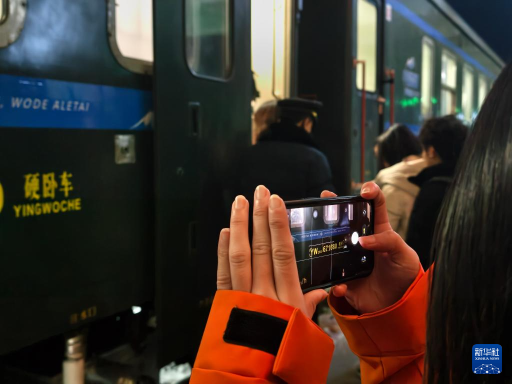 1月31日,台湾青年在阿勒泰搭乘“中国雪都·我的阿勒泰”号冰雪主题旅客列车返回乌鲁木齐。新华社记者 贺小童 摄