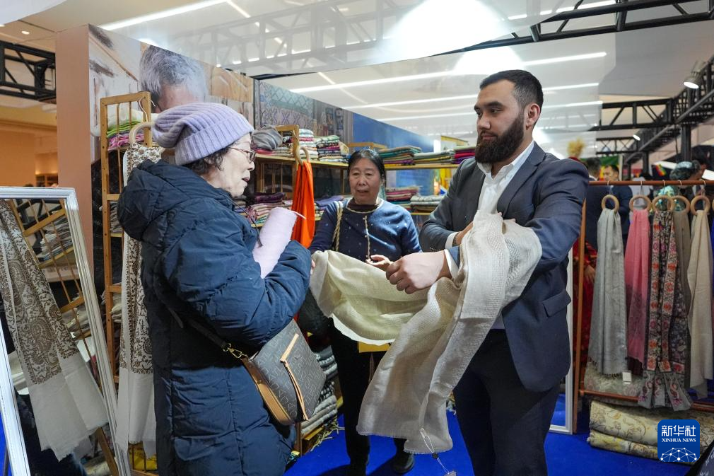 2月4日,在“共享大市场·出口中国”2026年首场活动暨北京国际精品荟的进口商品推介区,参观者(左)购买展出的乌兹别克斯坦围巾。新华社记者 鞠焕宗 摄