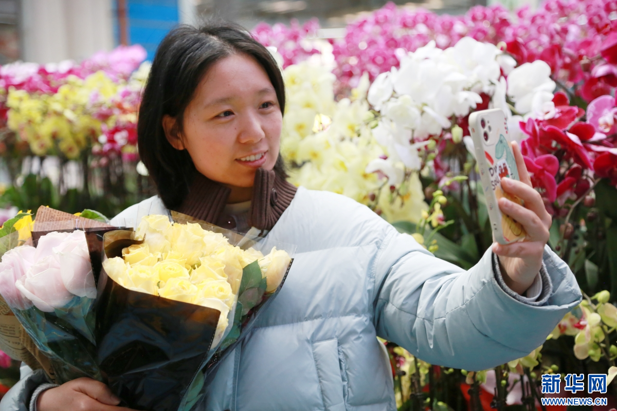 2月8日,游客在云南昆明斗南花卉市场与鲜花合影。新华网发(薛莹莹 摄)